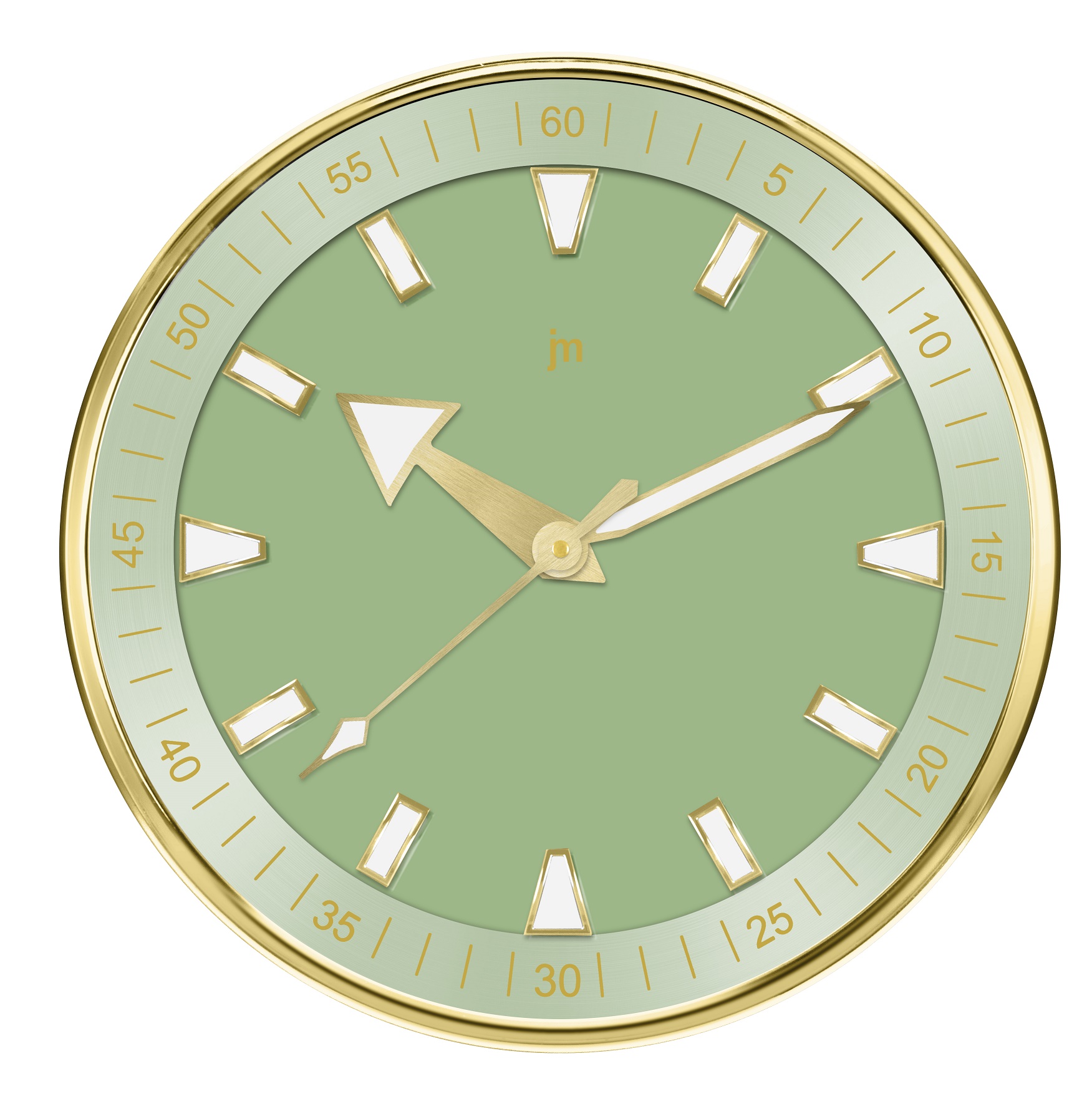 Orologio da parete al quarzo con cassa in ABScolore verde. Quadrante in alluminio spazzolato.Indici a rilievo. Vetro bombato. Movimento continuo silenzioso. dim. cm. 40,6