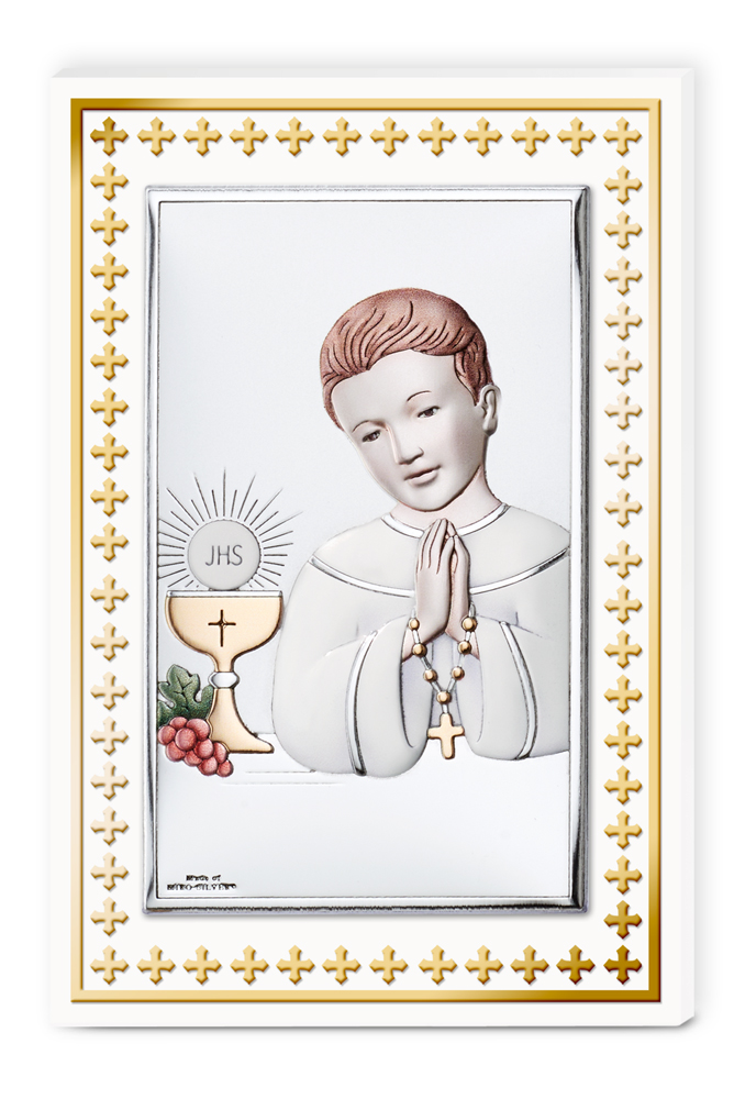 Icona comunione bimbo in legno con placca in argento laminato. Ricorrenze icone sacre comunione cm 9x13,5 - colore Marca: Valenti & co.Cod. prodotto:81508/3lcol