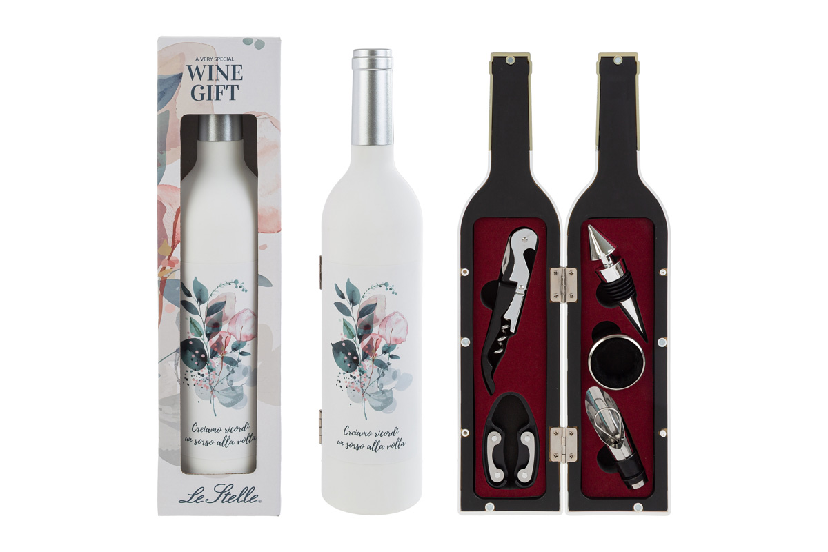 Il set Accessori 5pz Vino in Bottiglia Sorsi d'Amore è racchiuso in un elegante astuccio a forma di bottiglia, realizzato con dettagli moderni e raffinati. Ogni kit comprende cinque utensili in metallo, ideali per aprire, servire e conservare il vino con praticità. Il design curato, caratterizzato da una decorazione romantica, rende questo set particolarmente indicato come bomboniera per un matrimonio. Perfetto per sorprendere gli ospiti offrendo un accessorio utile e decorativo, si adatta facilmente a tavole e occasioni speciali. La dimensione compatta di 7X32 cm consente una facile esposizione e un'integrazione armoniosa nell'arredamento domestico.