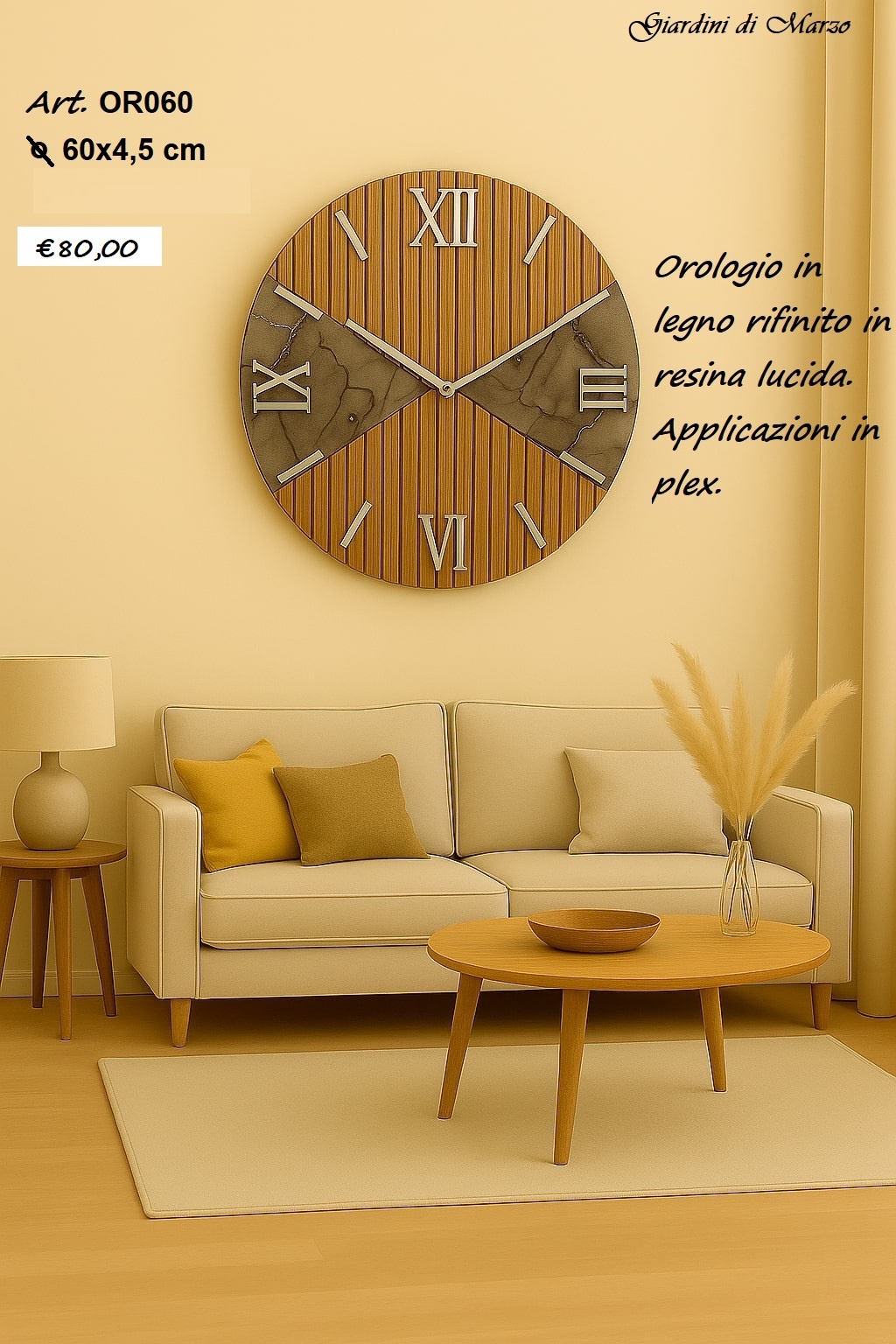 OROLOGIO IN LEGNO RIFINITURA IN RESINA LUCIDA CON APPLICAZIONI IN PLEX EFFETTO MARMO 60 CM GIARDINI DI MARZO