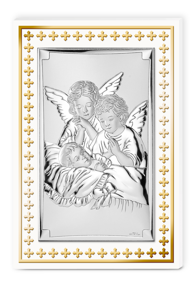 Pannello in legno e foglia oro "angeli custodi" con placca in argento laminato. Icone sacre bomboniere cm 9x13,5 Marca: Valenti & co.Cod. prodotto:81506/3l