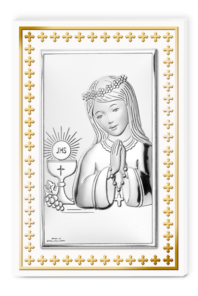 Icona comunione bimba in legno con placca in argento laminato. Ricorrenze icone sacre comunione cm 9x13,5 - colore Marca: Valenti & co.Cod. prodotto:l81509/3lcol