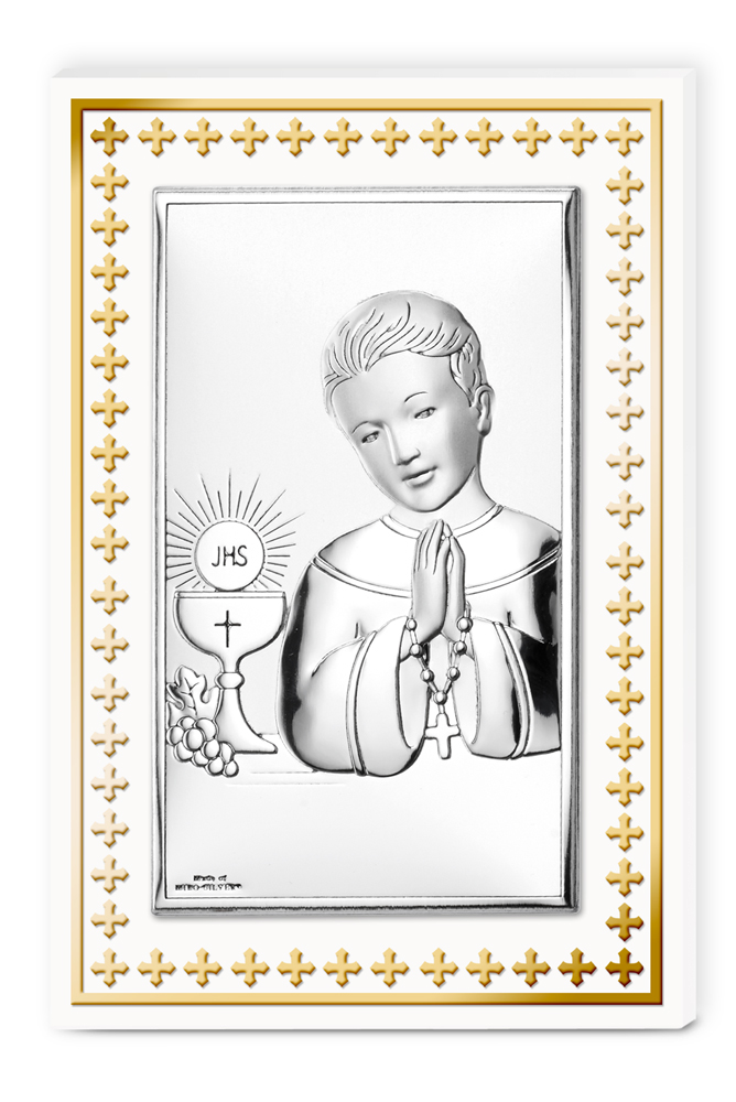 Icona comunione bimbo in legno con placca in argento laminato. Ricorrenze icone sacre comunione cm 9x13,5 - argento Marca: Valenti & co. Cod. prodotto:81508/3l