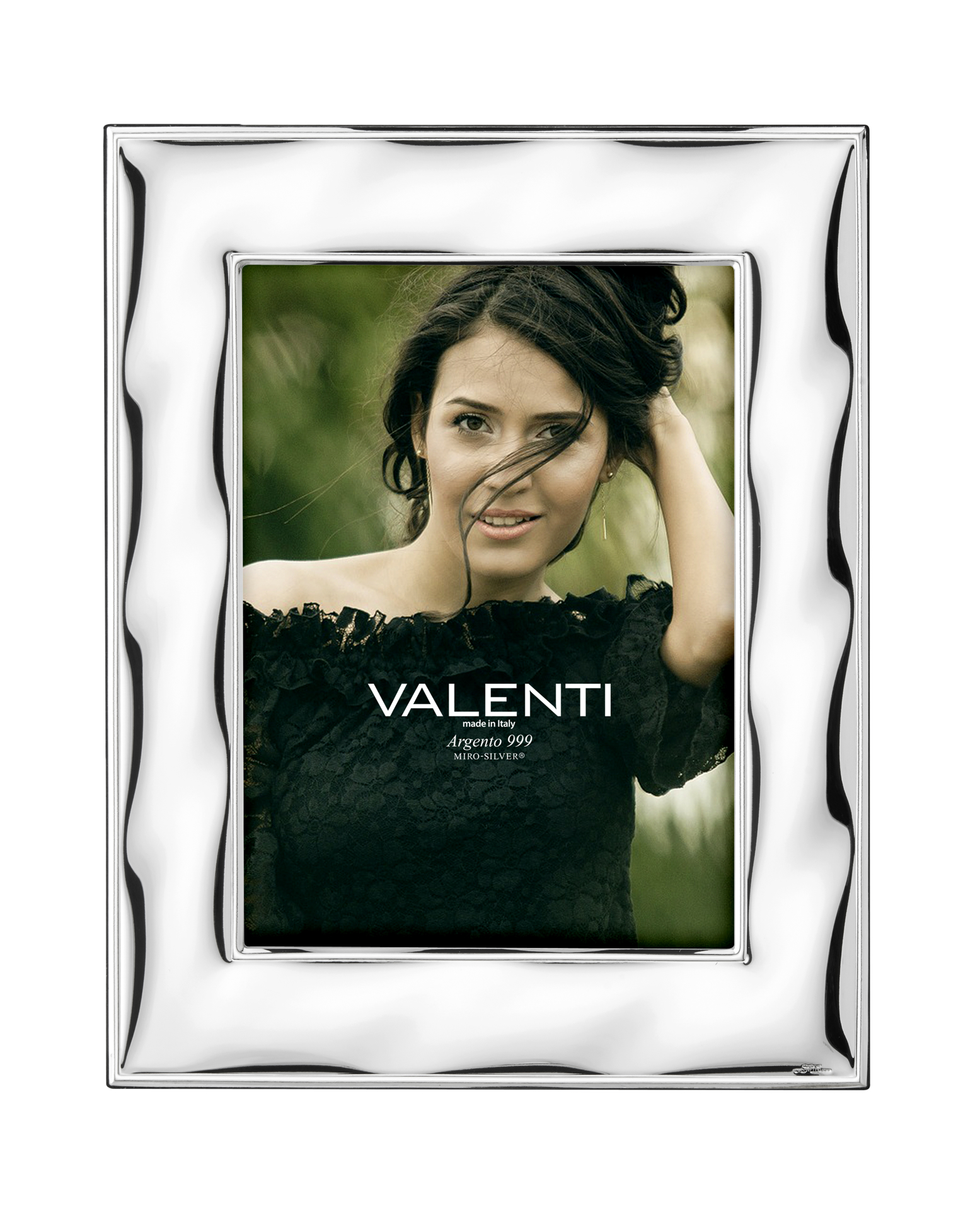 Portafoto in argento laminato acqua, retro legno. Generiche cornici misura foto cm 9x13 - retro marrone Marca: Valenti & co