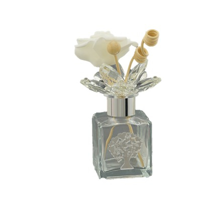 PROFUMATORE IN VETRO 5X5X H16 TRASPARENTE 100ML CON PLACCA ALBERO DELLA VITA ARGENTATO CON SCATOLA DA BOMBONIERA
