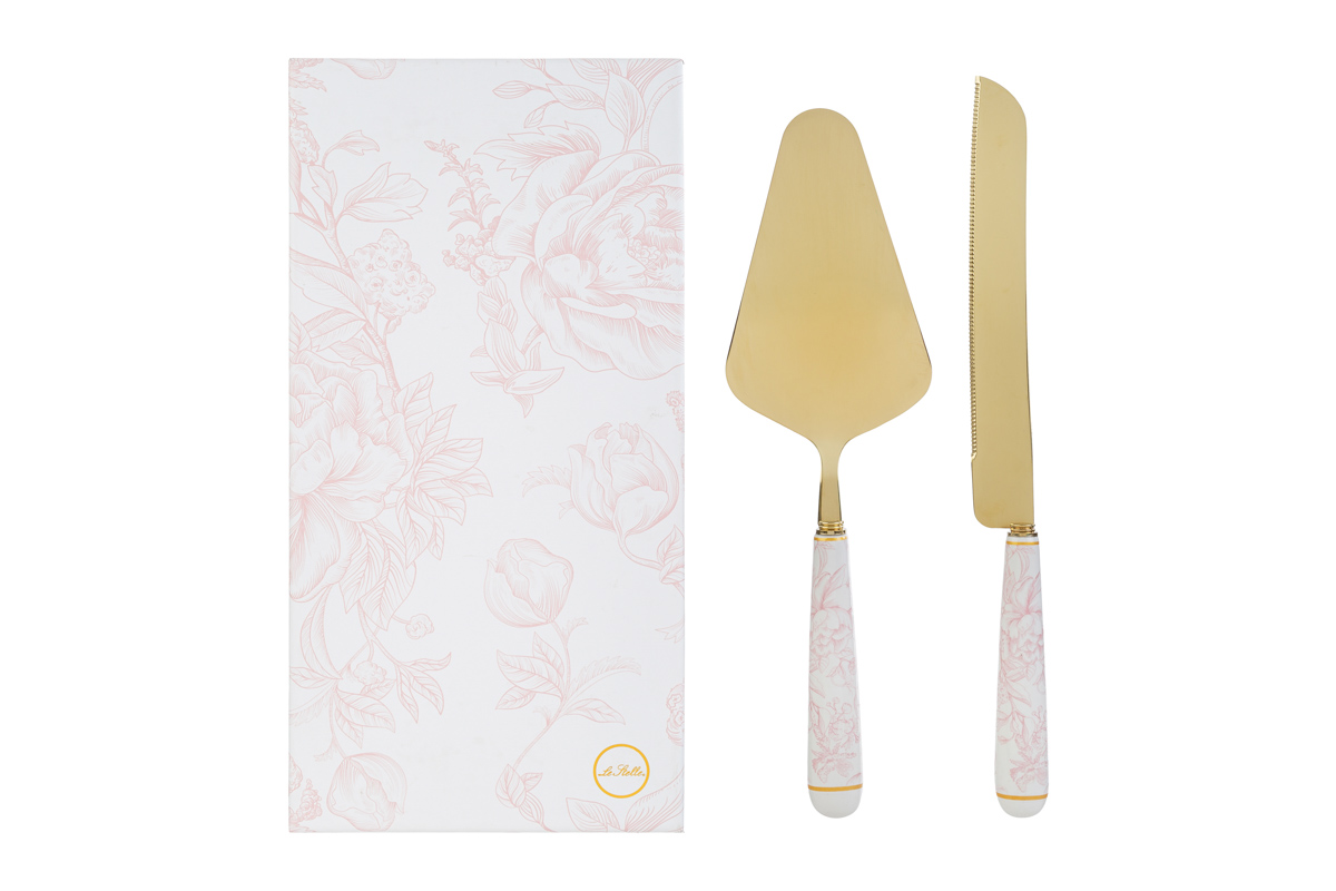 Questo set da due pezzi include una paletta e un coltello torta in metallo con eleganti manici decorati rosa. La finitura dorata valorizza i dettagli, rendendolo perfetto come bomboniera per matrimoni. Ideale per tagliare e servire la torta durante le cerimonie, offre un tocco raffinato e coordinato al momento del festeggiamento. La confezione con astuccio agevola sia la presentazione sia la conservazione degli utensili.