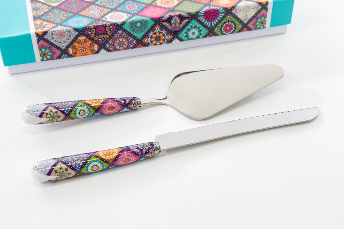 SET 2 PZ PALA TORTA E COLTELLO TORTA GIPSY 28 CM C/ASTUCCIO FONDO E COPERCHIO MATERIALE IN METALLO CON IMPUGNATURA PORCELLANA DECORATA